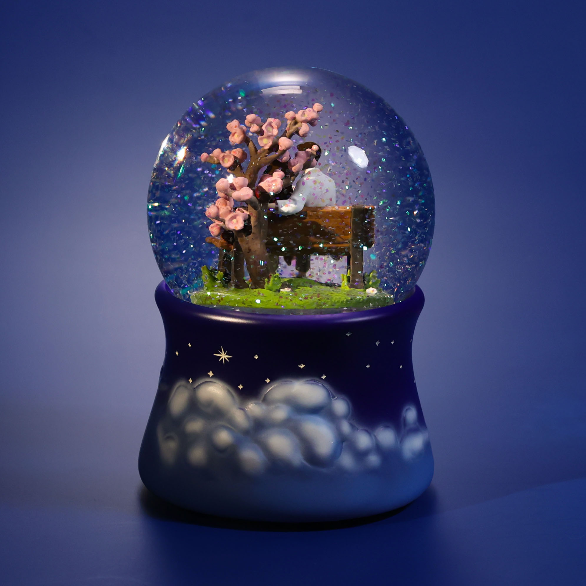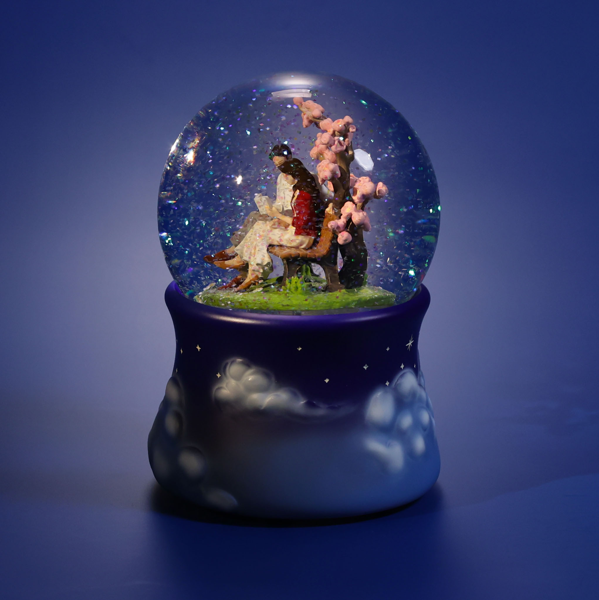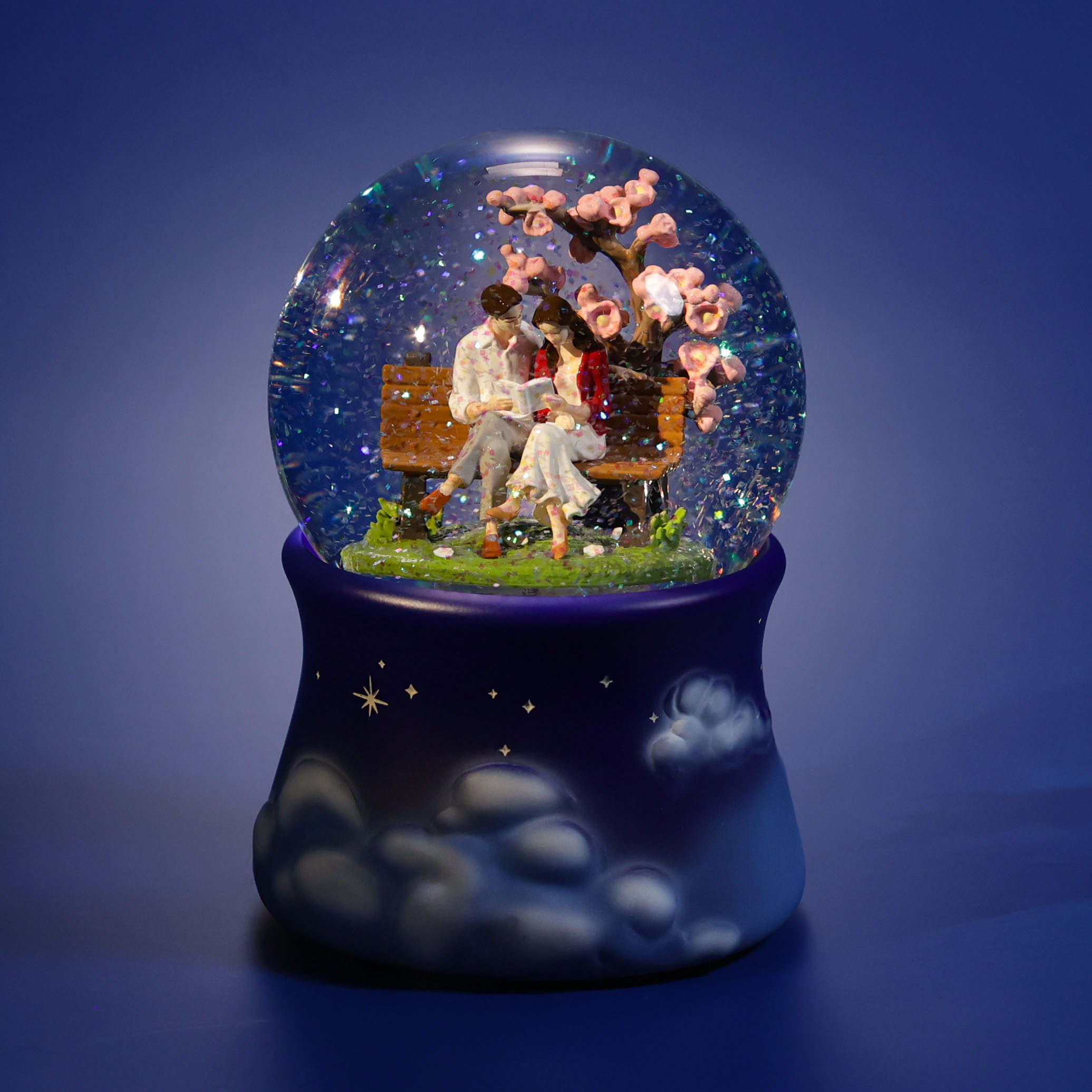 В прозрачном куполе, словно в волшебной капсуле времени, мерцают тысячи блёсток, окутывая волшебный миг любви. Под нежными лепестками сакуры, будто сотканными из розового шёлка, на скамейке сидят двое — их пальцы бережно перелистывают страницы книги, а в глазах светятся тихие истории, понятные только им двоим.