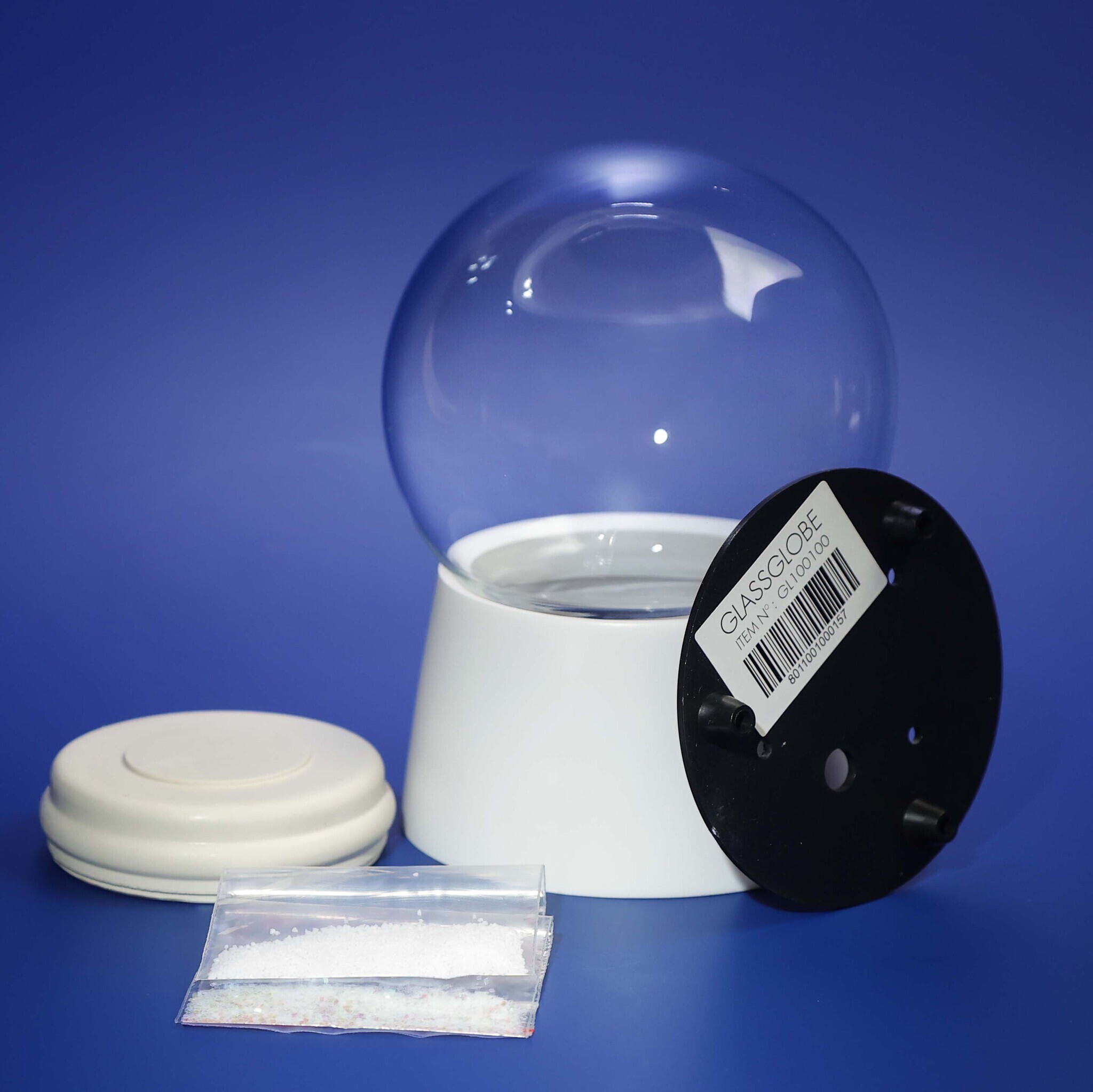 Комплект легко монтируется, просто добавьте собственную фигурку, наполните шар водой, установите резиновую пробку и запечатайте герметиком.