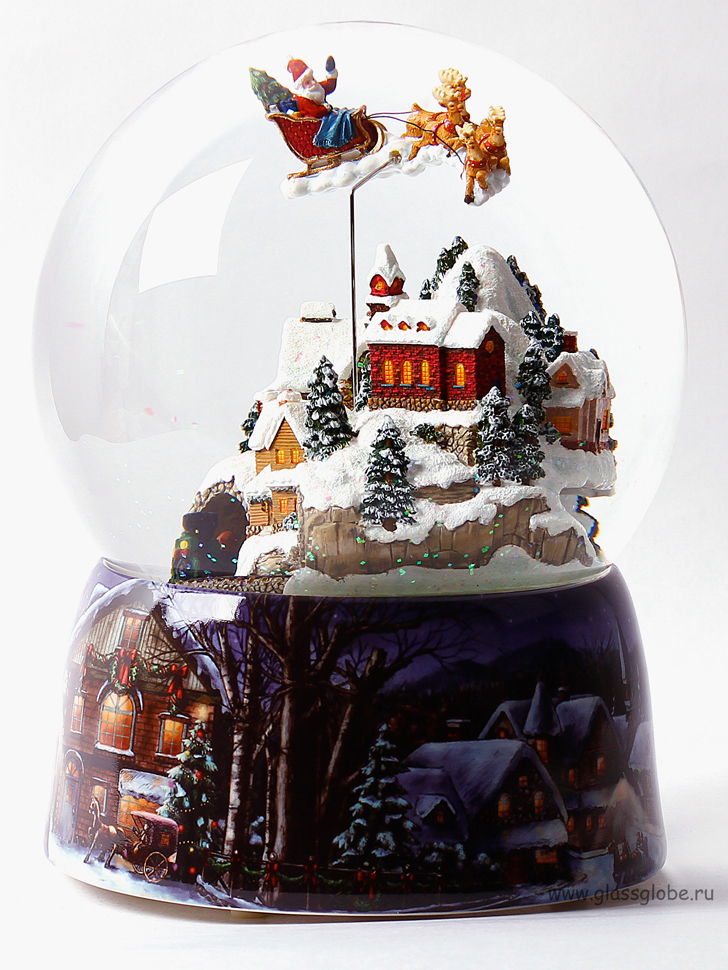 Установленный на высокую расписанную в тематическом стиле подставку, этот огромный шар представляет собой динамичную сюжетную композицию с движущимися деталями и музыкальным сопровождением. Он порадует как маленьких мечтателей и любителей зимних сказок, так и взрослых коллекционеров и поклонников красивых интерьерных деталей.